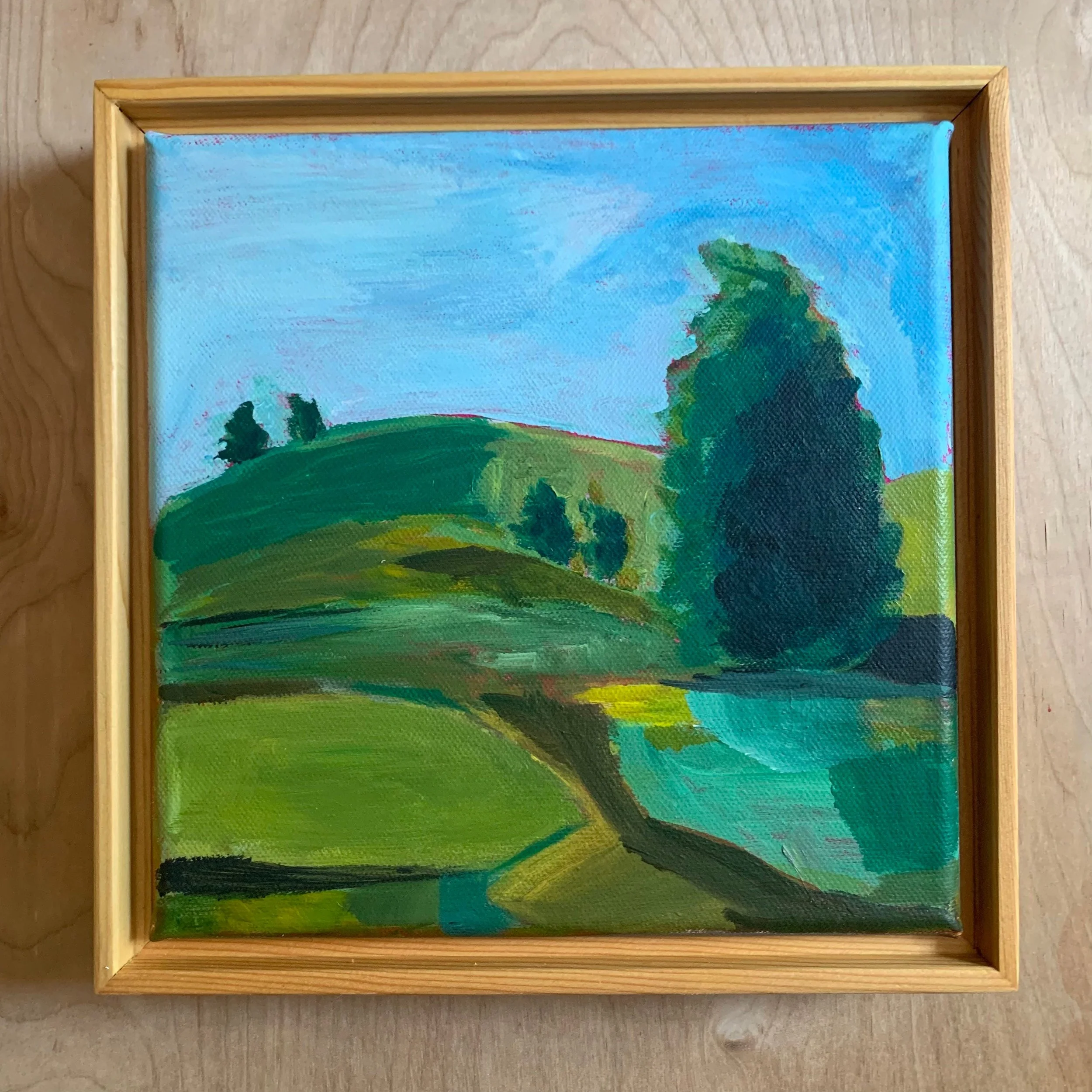 “Bluebird Hills" - Original acrylic painting on gallery wrapped canvas. Painting measures 8 x 8 inches framed with a 9 x 9 floater frame. Wired on the back for easy hanging. Perfect addition to any gallery wall.